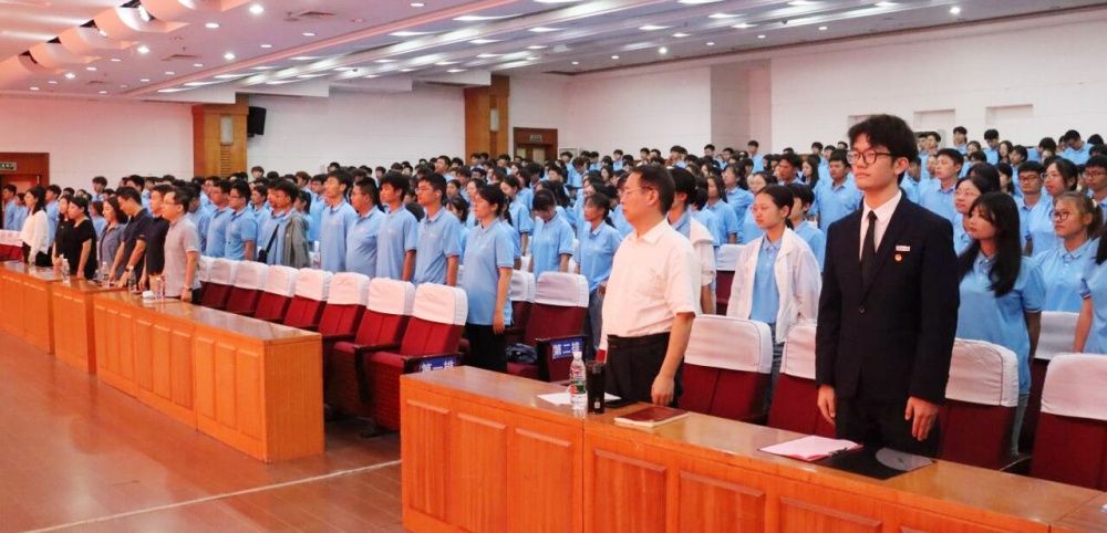 新生见面会在庄严的国歌声中拉开帷幕,全体师生起立,以崇高的敬意奏唱国歌。