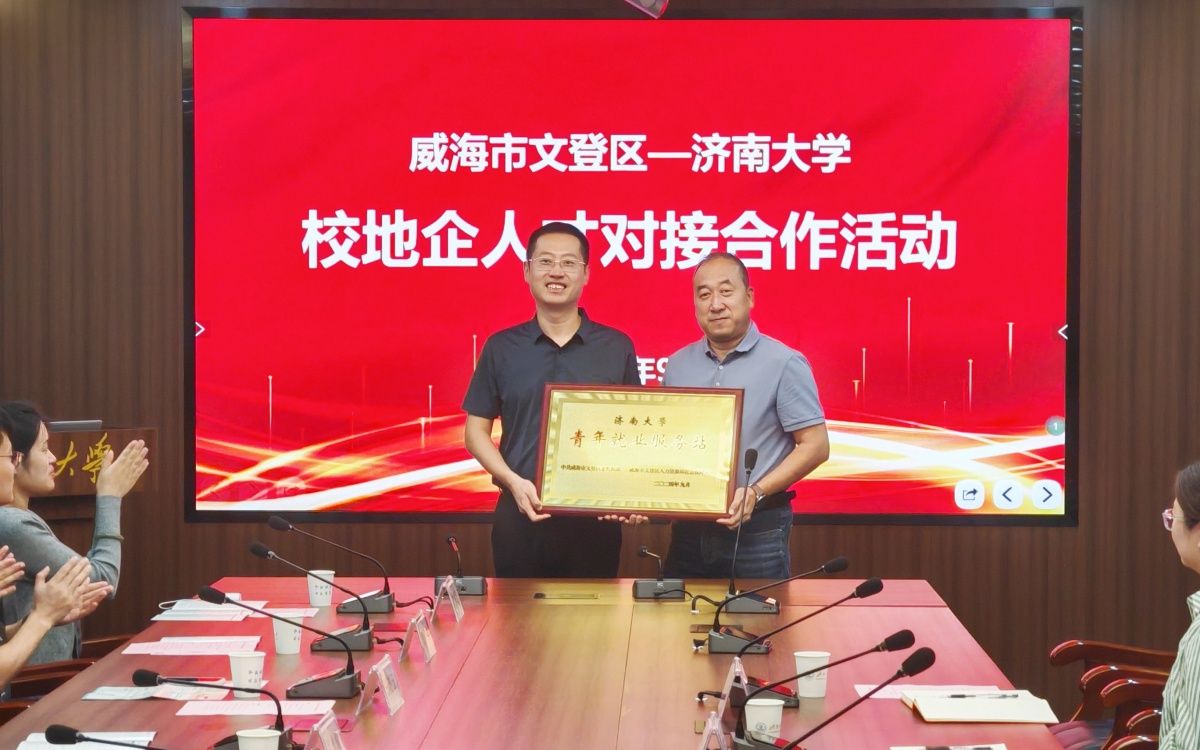 活动中,威海市文登区在学校建立“青年就业服务站”,董俊杰与王建彬共同为服务站揭牌。