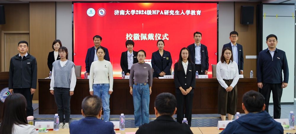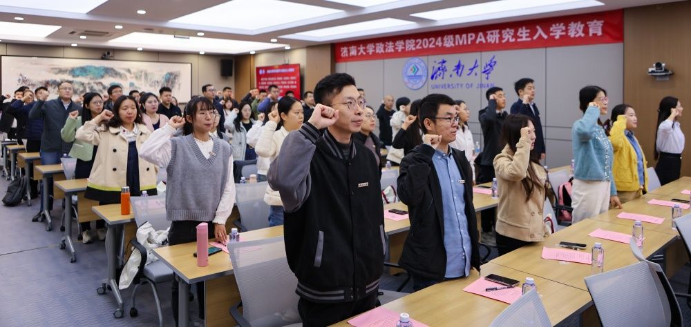 接下来,与会领导和老师代表共同为新生代表佩戴校徽,既象征着2024级MPA研究生正式成为政法学院的一员,也寄托了学院对大家的殷切期望和美好祝愿。随后,在2024级MPA研究生李静雯带领下,全体新生举起右拳,铿锵有力地郑重宣读研究生“新生誓词”,用宣誓许下对未来的承诺。