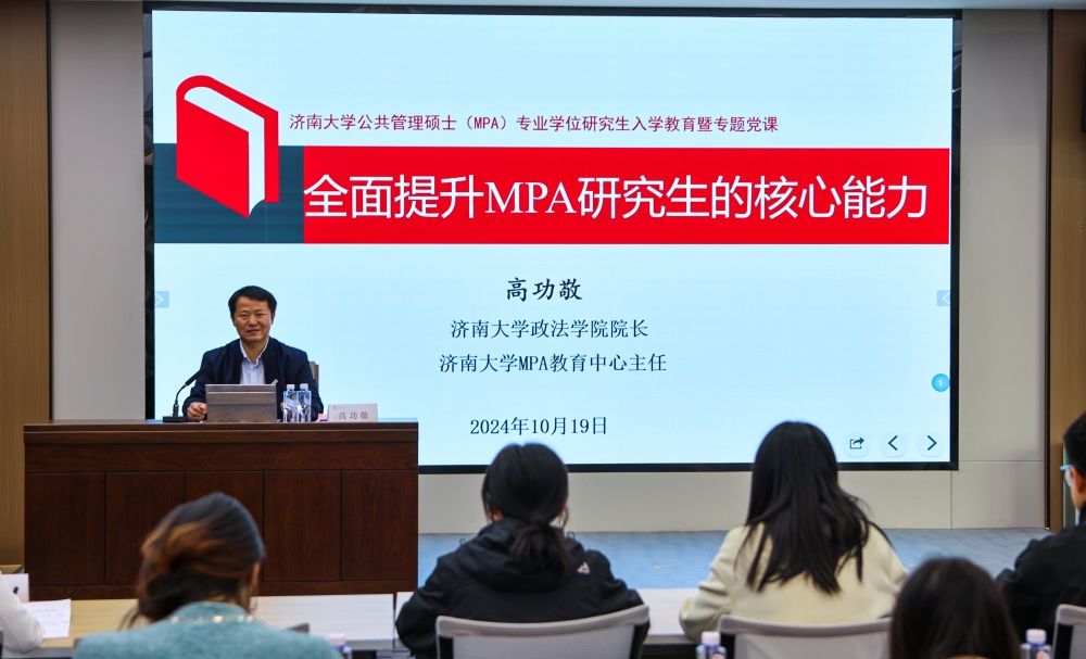高功敬为新生作了题为“全面提升MPA研究生的核心能力”的专题报告暨主题党课。他结合习近平总书记重要讲话精神、毛泽东调查研究思想和经典著作,以及研究生阶段学习的目标要求,重点解读了MPA研究生需要具备的四项能力:政治能力、思维能力、调研能力和学习能力。