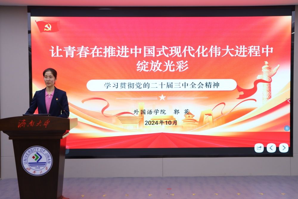 为深入学习贯彻党的二十届三中全会精神,积极响应党的二十届三中全会对于教育、科技、人才等方面提出的新部署、新要求,10月30日,外国语学院党委副书记、副院长郭英以《让青春在推进中国式现代化伟大进程中绽放光彩》为题为学生党员、入党积极分子作宣讲报告。
