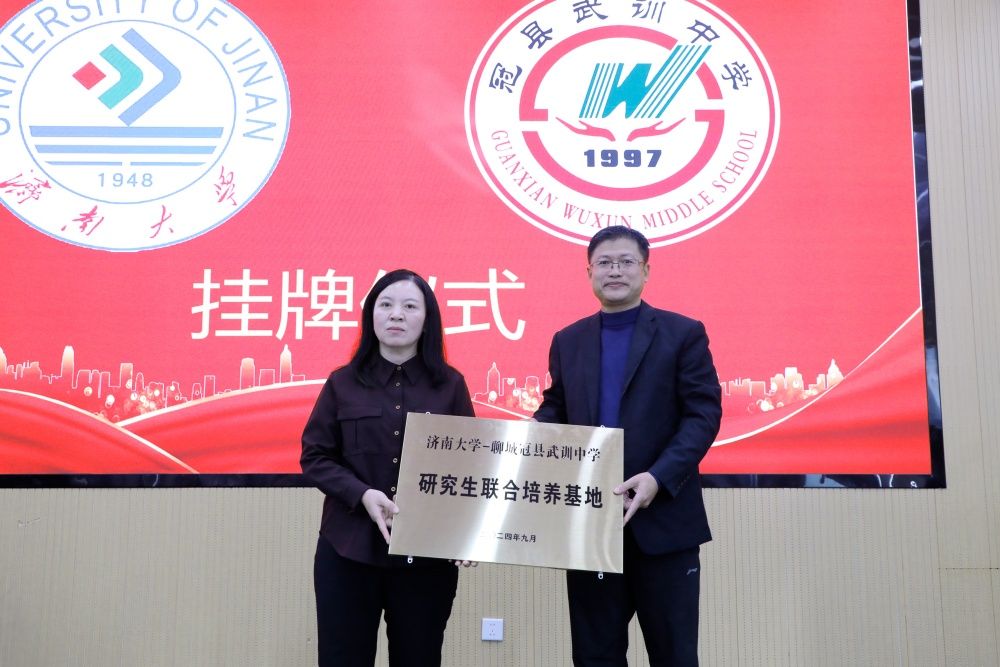 紧接着,武训中学举行研究生实践基地揭牌仪式,由范丽敏为武训中学研究生实践基地挂牌。张志全向王彦林、王连军、牛安明三位老师颁发研究生校外合作导师聘书。武训中学为范丽敏授“范丽敏教授工作室”牌。随后,范丽敏为冠县全体中学骨干语文教师作报告,主题为《谈儒家原典精神——“情”》,以中学教育必读经典——《红楼梦》为例,对其思想内涵进行深度解析,对贾宝玉的形象进行详细解读,受到现场师生的热烈欢迎。