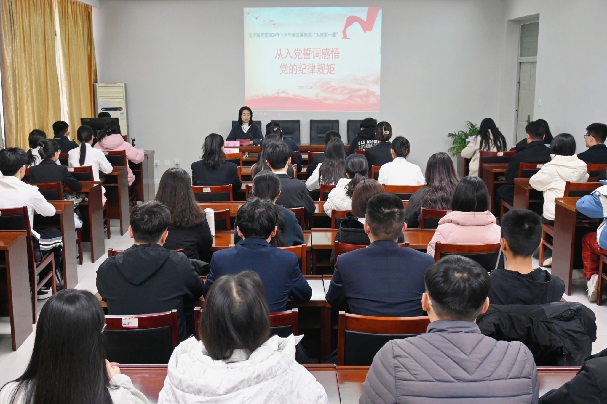 为增强新发展党员党性修养,牢固构筑政治信仰基石,12月10日,文学院举行了2024年下半年预备党员入党宣誓大会暨新发展党员“入党第一课”。学院党委副书记、副院长潘颖,各学生党支部书记,全体辅导员,本学期新发展的57名预备党员,部分学生党员代表参加会议。会议由文学院组织员高芳荟主持。