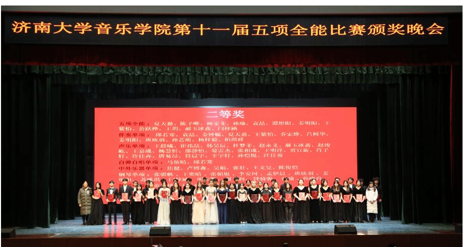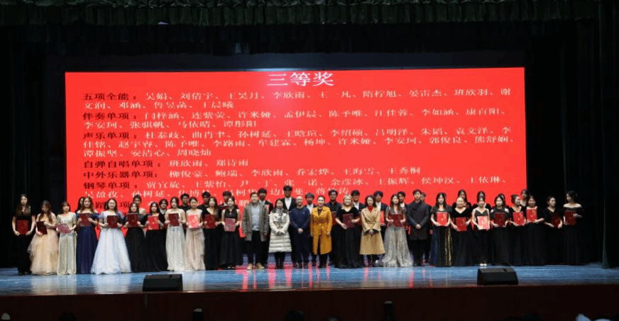 晚会伊始,学校党委常委、统战部部长徐庆国,音乐学院班子成员以及系主任,分别为荣获全能组、单项组一、二、三等奖的同学们进行颁奖并合影留念。