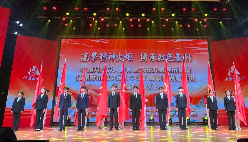仪式上,与会领导为沂蒙精神志愿宣讲团等10个宣讲团队代表授旗,学院“回沂”沂蒙精神志愿宣讲团代表颜子博上台接旗。