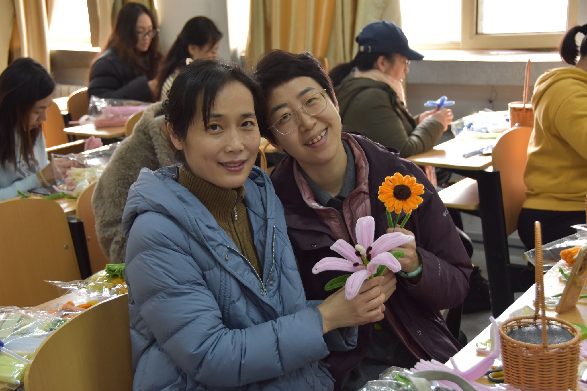 学院工会精心准备了五彩缤纷的扭扭棒等材料,并通过视频演示与现场教学相结合的方式,详细讲解花卉造型的制作技法。在温馨愉悦的氛围中,女教师们化身巧手艺术家,将柔软的扭扭棒缠绕出郁金香、向日葵等形态各异的花卉。指尖翻飞间,象征节日的花束渐次成型,晶莹的珠链点缀其间,最终组合成独具个性的艺术花篮。活动现场欢声笑语不断,艺术创作与情感交流相互交织,充分展现了女教师们优雅从容的精神风貌。