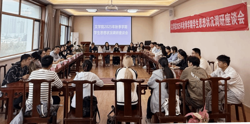 为全面了解新学期学生的思想动态及学习生活需求,进一步增强学生思想引领工作的针对性、时效性与主动性,近日,文学院在第三教学楼419室召开2025年秋季学期学生思想状况调研座谈会。学院党委书记朱海龙,党委副书记、副院长潘颖出席会议,全体辅导员,教学管理办公室相关工作人员,以及各年级学生代表共同参加座谈会。