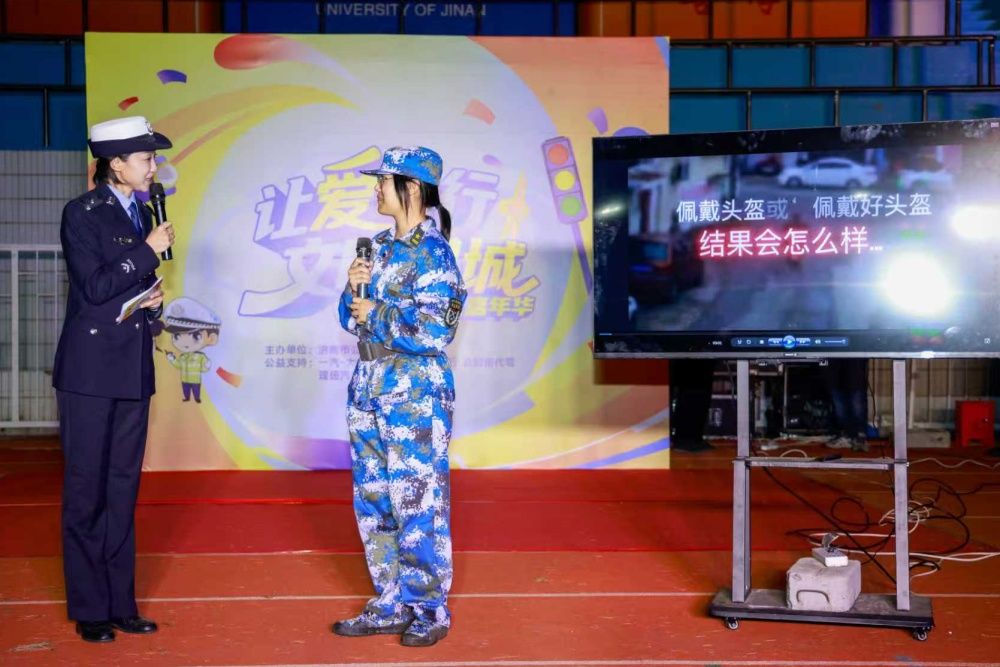 活动尾声,领导嘉宾走进游戏区,与新生共同体验“模拟过马路”项目,手把手指导新生辨别交通信号灯、避让机动车的正确方法。在主持人的带领下,全场师生齐声高呼“安全出行,让爱同行;文明泉城,从我做起”的倡议,嘹亮的口号回荡在运动场上空,成为本次活动最动人的收尾。