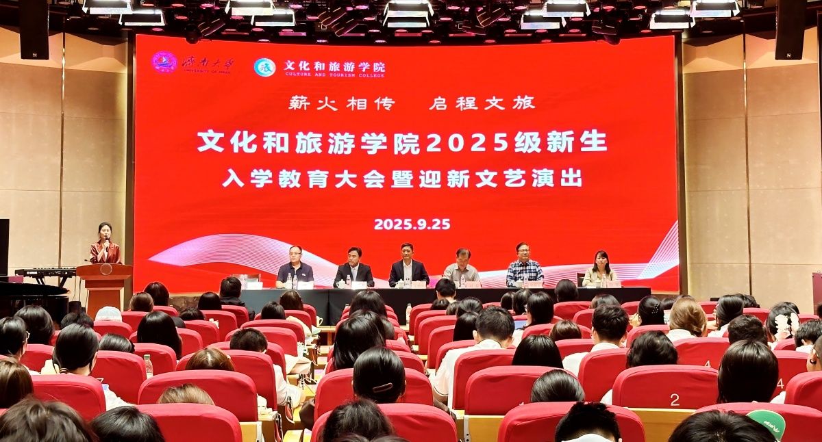 9月25日下午,文化和旅游学院“薪火相传 启程文旅”2025级新生入学教育大会暨迎新文艺演出在济南老年人大学报告厅举行。学院全体党政领导班子成员,各系教师代表、全体辅导员、新生班主任以及2025级全体本科生和研究生共同参加了这场青春盛典。活动还特别邀请到济南舜耕山庄集团副总经理,济南舜耕山庄酒店管理有限公司董事长、总经理,山东省饭店协会会长黑伟钰先生出席。活动由学院党委副书记、副院长信苏珊主持。