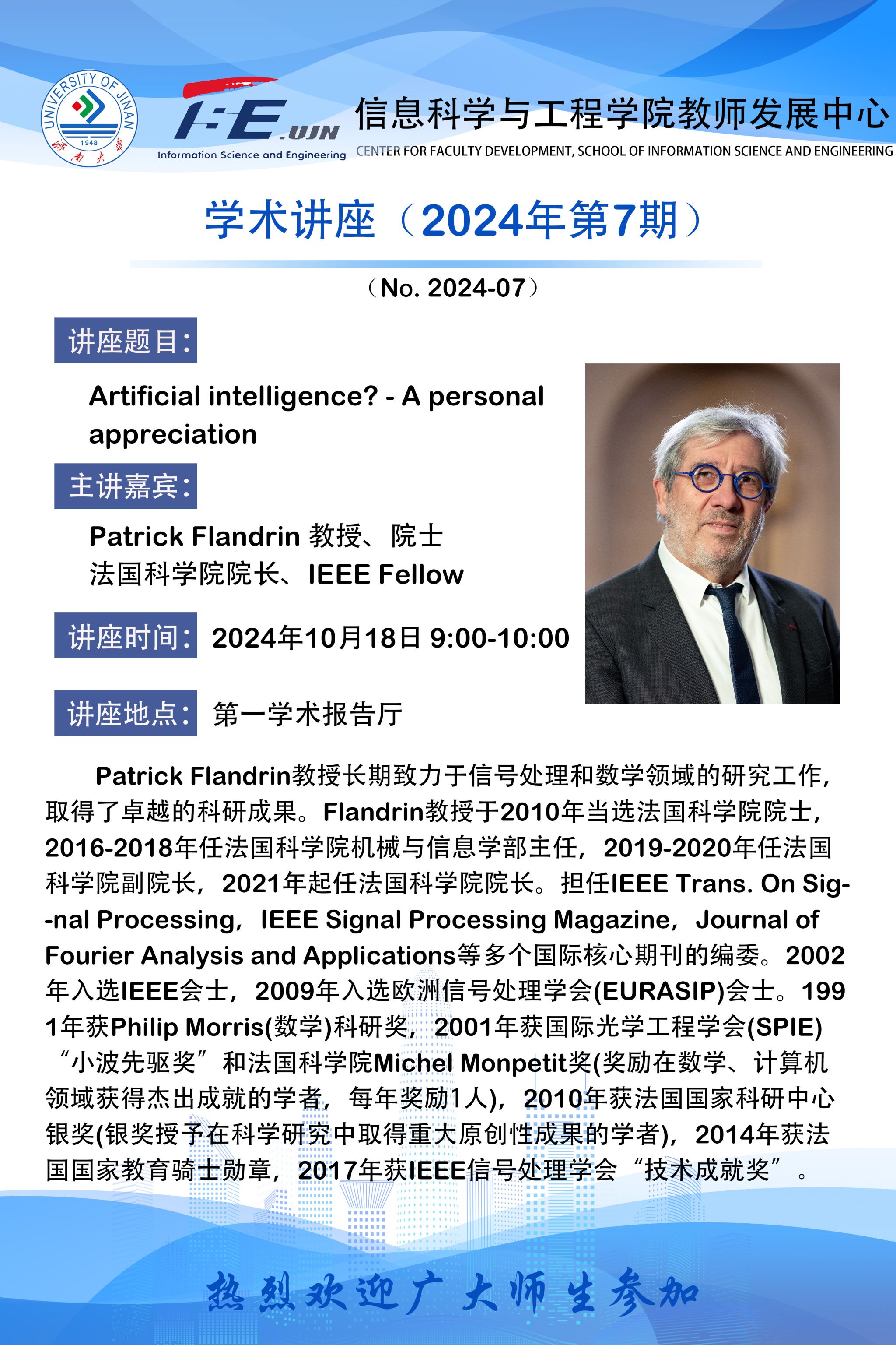 信息科学与工程学院学术讲座:法国科学院院长Artificial intelligence? - A personal appreciation