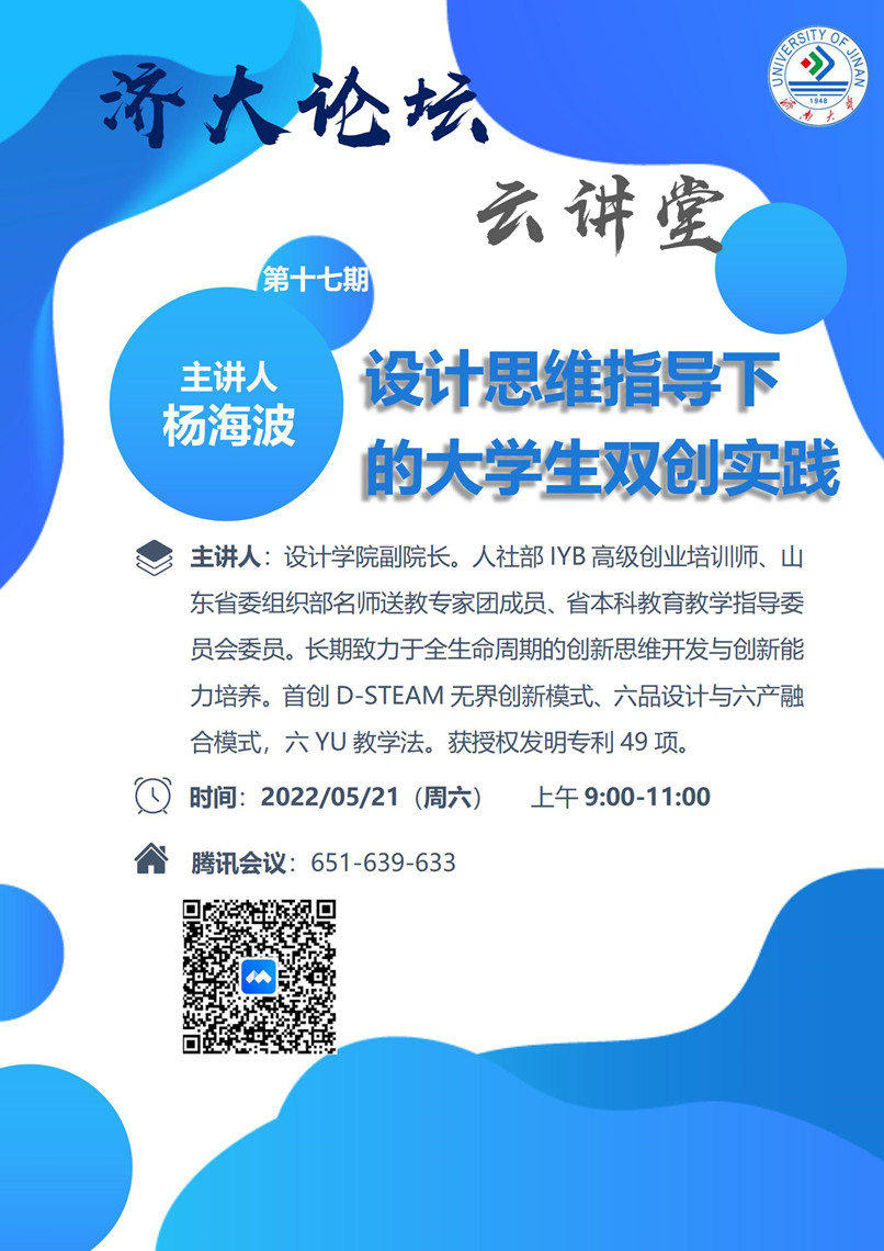 济大论坛“云讲堂”第十七期:设计思维指导下的大学生双创实践